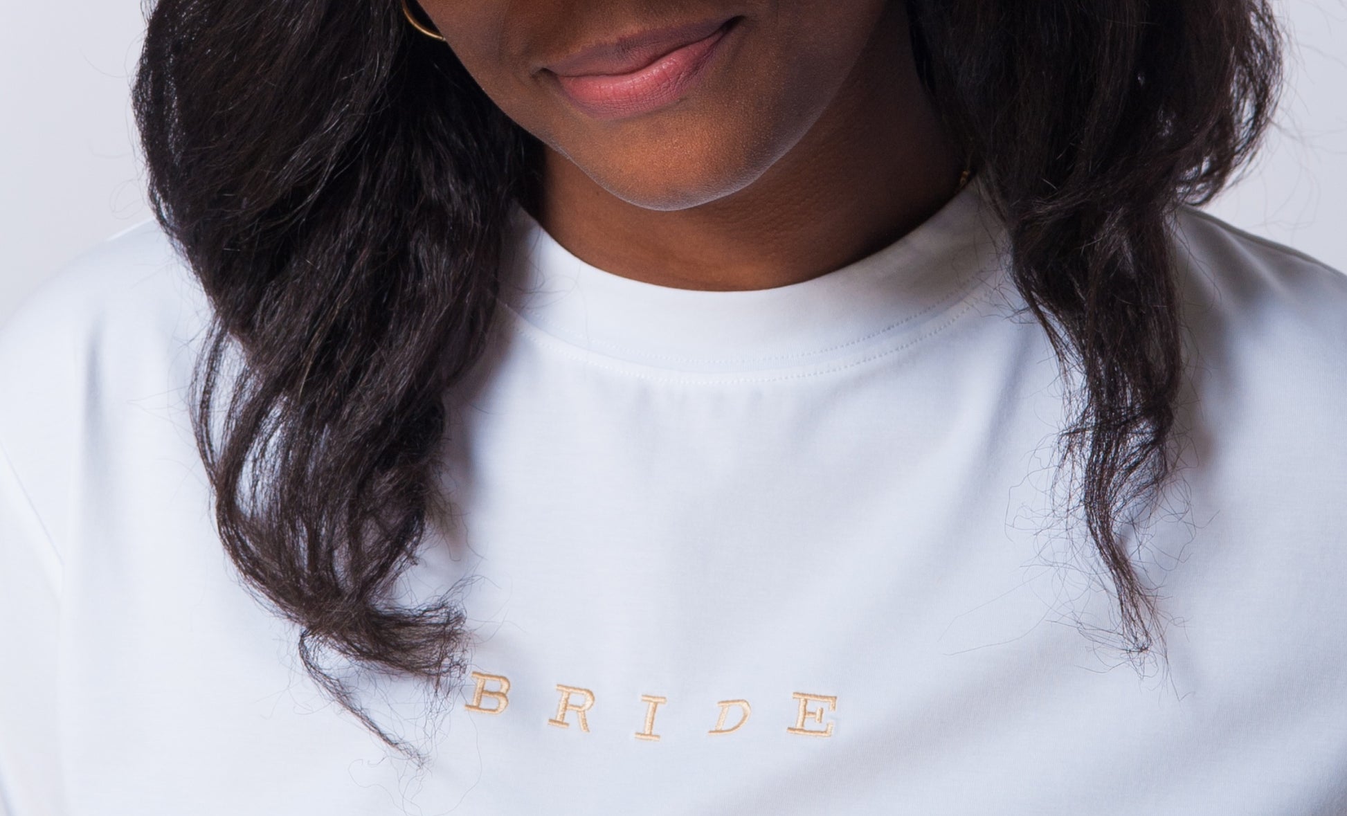 Perfect for all bridal events. Made for everyday wear, our embroidered BRIDE tee will definitely become a staple in your closet long after the wedding planning process. Designed in our softest cotton mix our luxurious embroidered BRIDE tee is a subtle statement for any bride to be.
